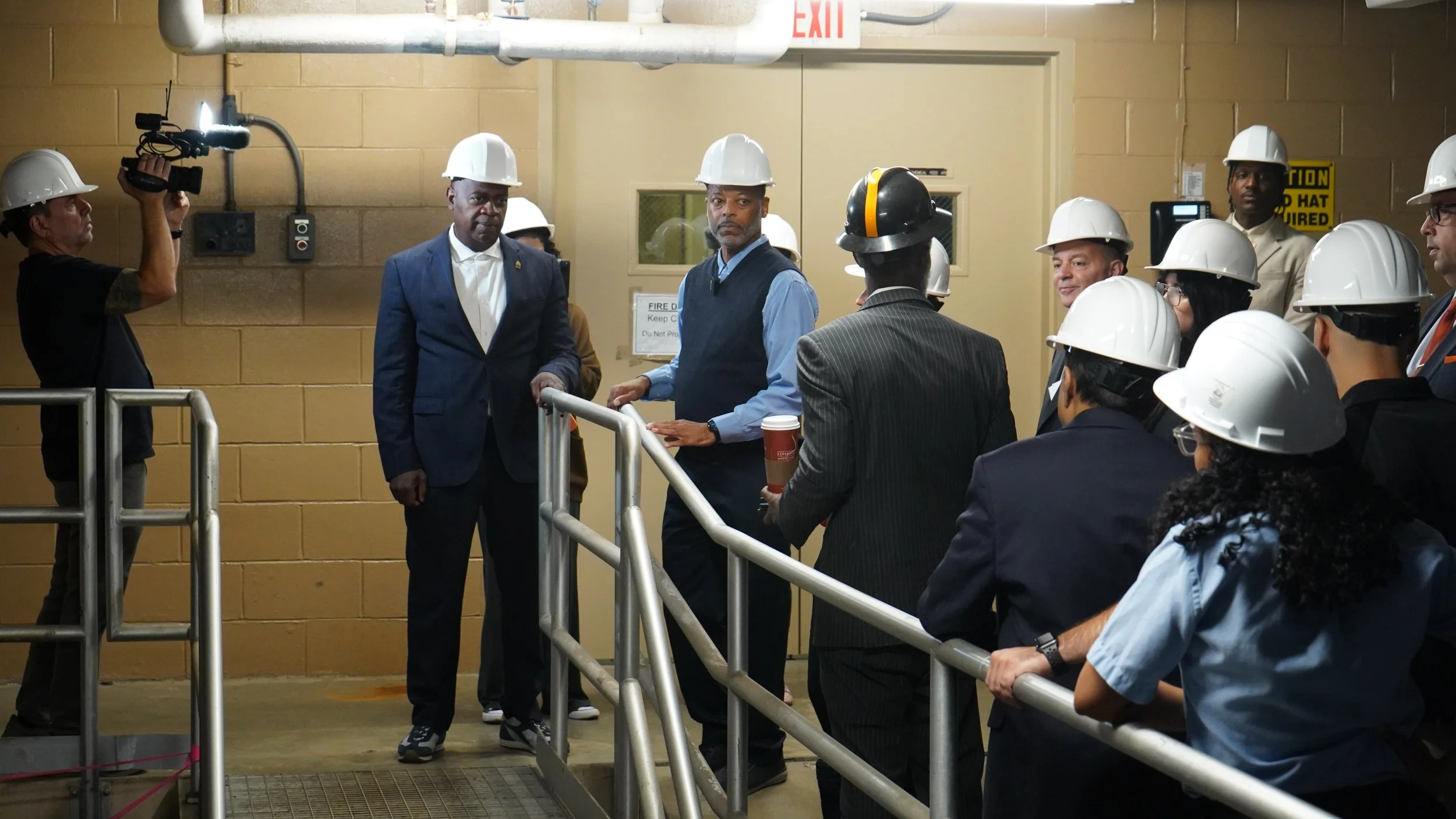 Mayor Ras Baraka (left), Newark Watershed Superintendent Kevin Greer (light blue sleeves), and visitors wearing hard hats during a tour of the newly-upgraded Pequannock Water Treatment Plant. Courtesy of Newark Water & Sewer, September 2025.